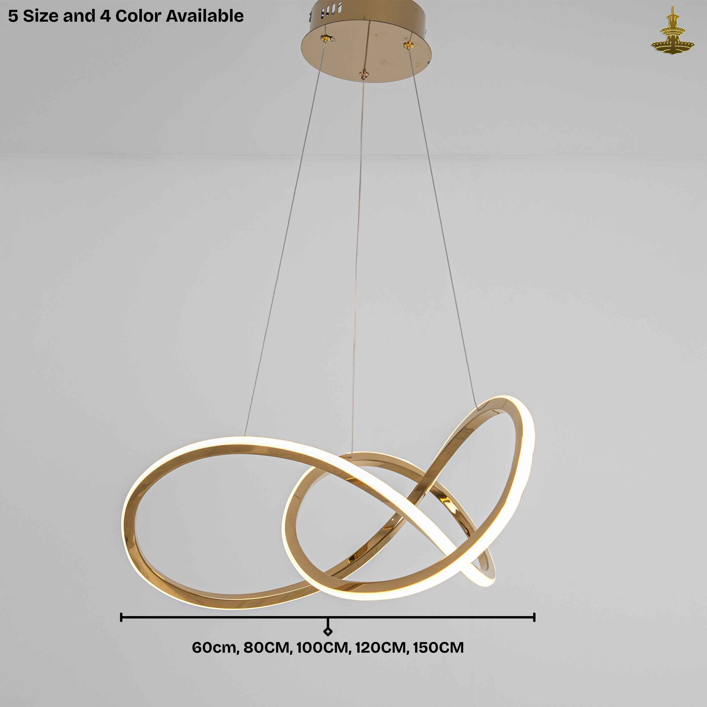 Available in four stunning finishes—Gold, Chrome, Black, and White—this chandelier seamlessly complements a variety of modern and contemporary interiors. It comes in five sizes: 60cm (30W), 80cm (50W), 100cm (70W), 120cm (100W), and 150cm(130W), offering the right scale and brightness for rooms of all sizes. Whether you're styling a cozy bedroom or a spacious living area, this light fixture delivers the perfect balance of form and function.